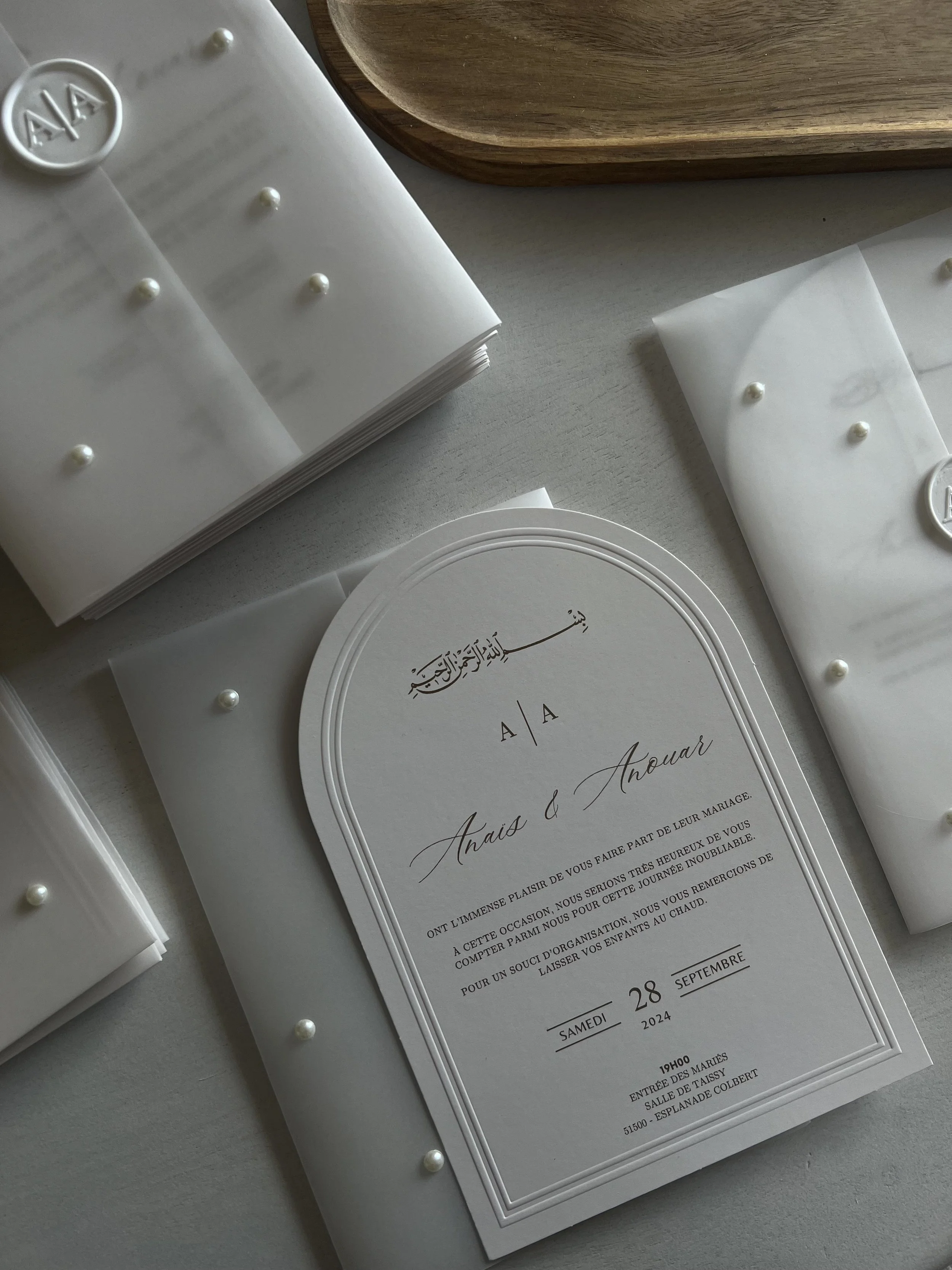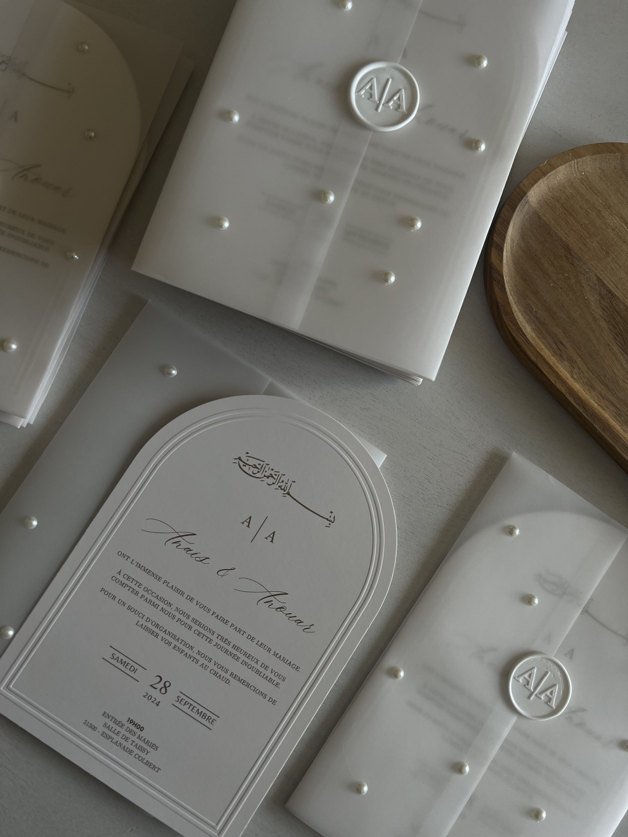 L’enveloppe transparente, délicatement ornée de perles, rend chaque invitation unique et s’accompagne d’un sceau de cire personnalisé à vos initiales.